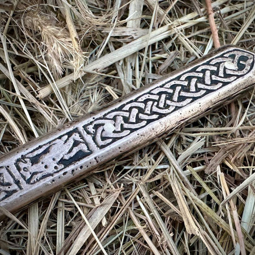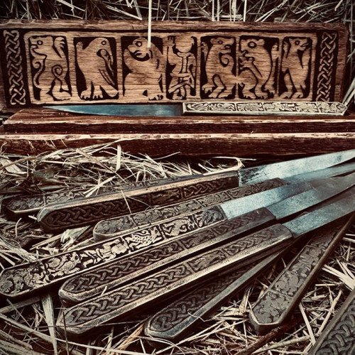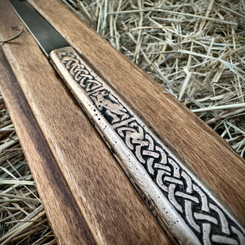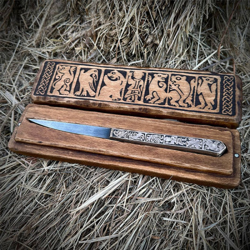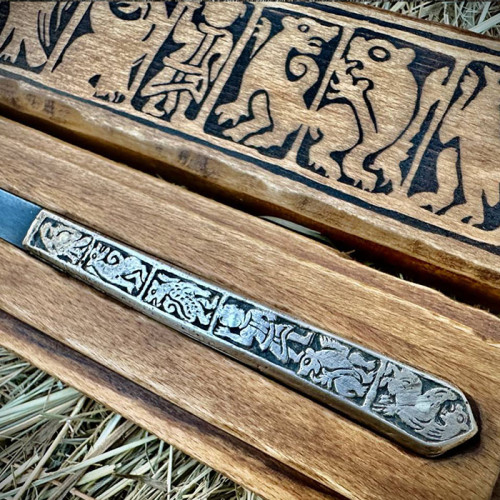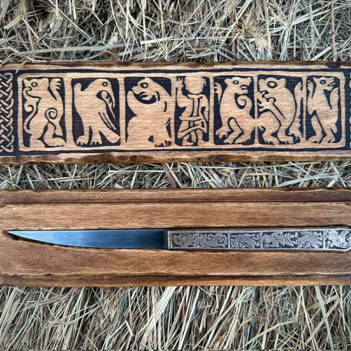 Цей ніж – унікальна реконструкція середньовічного артефакту, відтворена за мотивами археологічних знахідок у місті Володимир, Україна. Поєднуючи вишукане мистецтво різьблення з функціональністю, характерною для ножів Київської Русі та скандинавських народів, він стане цінним експонатом для колекціонерів, реконструкторів та поціновувачів історичних артефактів.