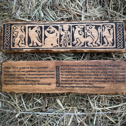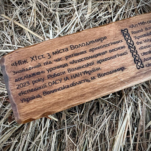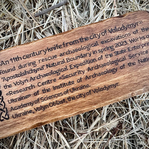 Цей ніж – репліка оригінального зразка, знайденого під час рятувальних археологічних розкопок в урочищі “Апостольщина” навесні 2023 року. Дослідження проводила Волинська археологічна експедиція ДП “Науково-дослідний центр “Охоронна археологічна служба України” Інституту археології НАН України.